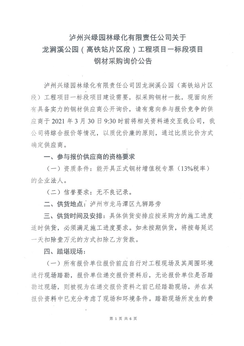 龍澗溪公園(高鐵站片區(qū)段)工程項(xiàng)目一標(biāo)段項(xiàng)目 鋼材采購(gòu)詢價(jià)公告